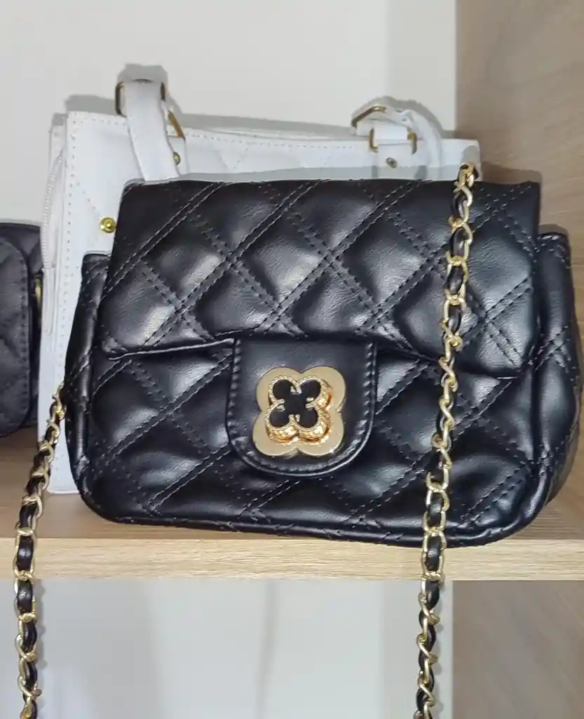 Dale un toque de glamour a tus outfits con este bolso mini de diseño acolchado en color negro. Cuenta con una elegante cadena dorada que puedes llevar al hombro o cruzada, y un broche frontal en forma de flor con acabado dorado y negro que añade distinción y estilo. Ideal para salidas nocturnas, cenas, eventos o para elevar tu look diario.