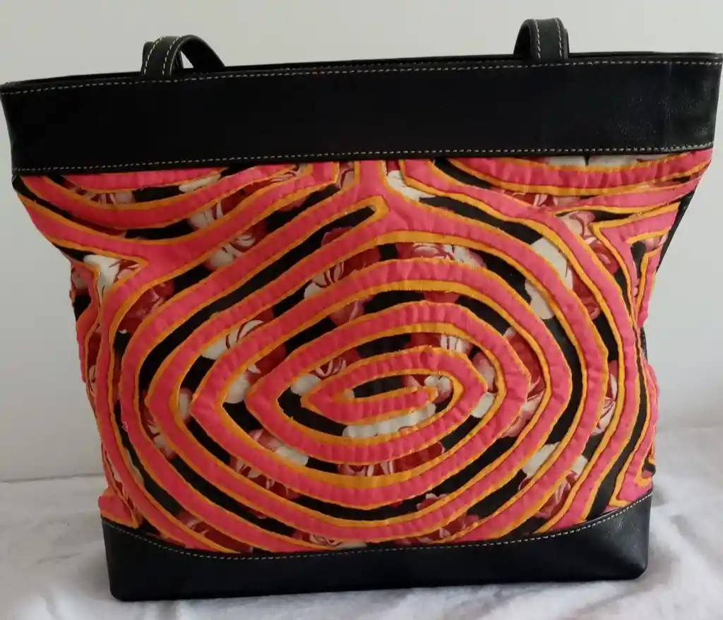 Elaborado en cuero color negro y con diseño de las tradicionales molas colombianas.