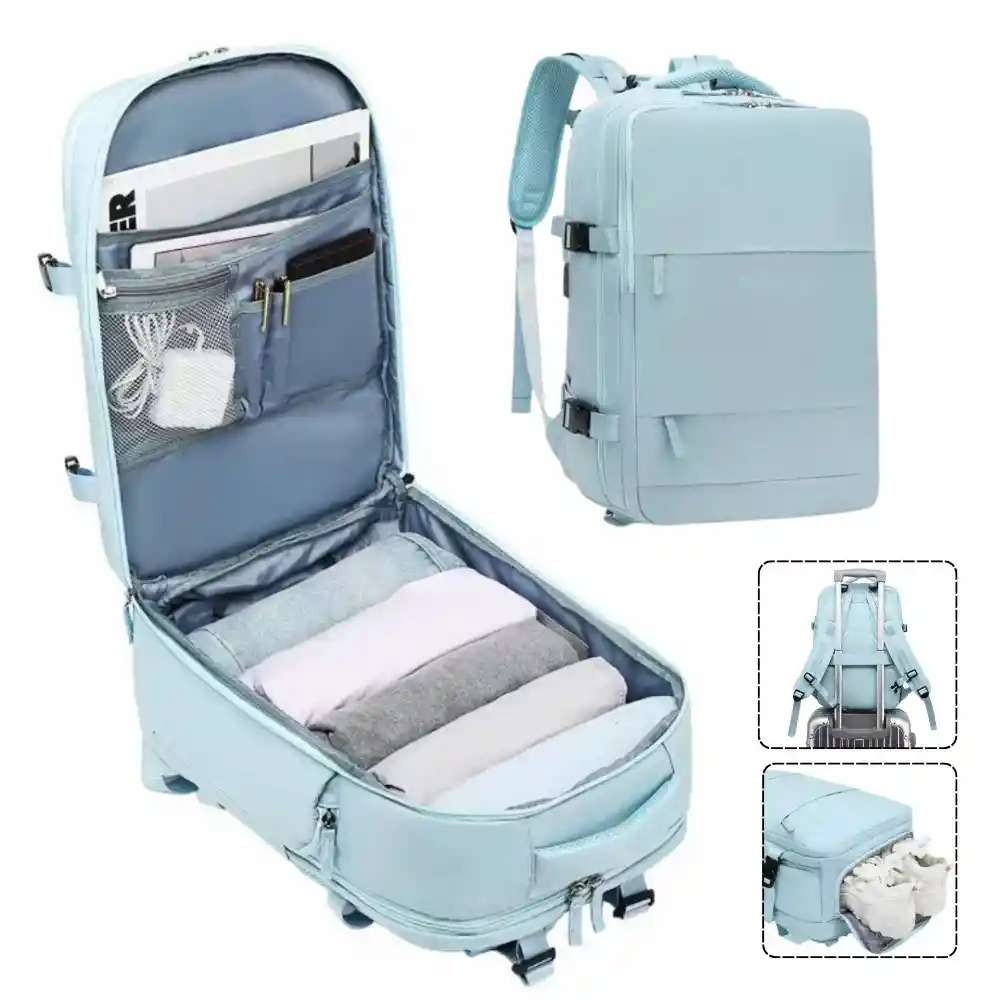 Este Maletín Viajero es todo lo que necesitas: estilo moderno, estructura y comodidad total. Diseñado para mujeres y hombres que viajan ligeros pero bien organizados. Diseño resistente al agua y materiales duraderos que cuidan tus pertenencias de la lluvia y el desgaste del viaje. Espacio inteligente, acceso total: Con apertura de 180° tipo maleta, empacar será rápido y ordenado. Sus compartimentos amplios e internos te permiten llevar desde ropa y tecnología, hasta tus artículos personales, todo en su lugar. - Correas acolchadas y ajustables para llevarlo como mochila. - Asas superiores para usarlo como bolso o maletín. - Tamaño aprobado como equipaje de mano en la mayoría de aerolíneas. - Diseño antirrobo con cierres reforzados y bolsillos ocultos. - Compartimento separado para zapatos Ideal para: viajes, trabajo, gimnasio o uso diario. Lleva de 3 a 5 mudas, con espacio extra para tus esenciales.