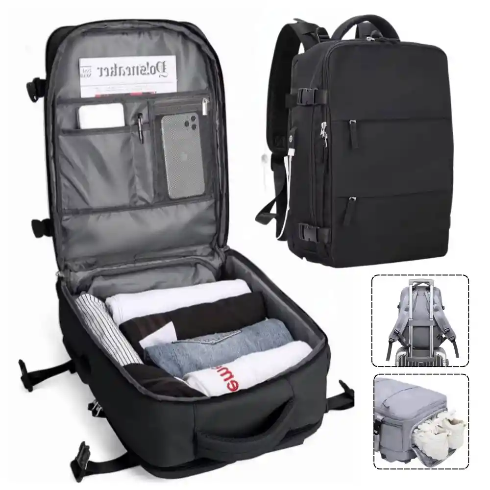 Este Maletín Viajero es todo lo que necesitas: estilo moderno, estructura y comodidad total. Diseñado para mujeres y hombres que viajan ligeros pero bien organizados. Diseño resistente al agua y materiales duraderos que cuidan tus pertenencias de la lluvia y el desgaste del viaje. Espacio inteligente, acceso total: Con apertura de 180° tipo maleta, empacar será rápido y ordenado. Sus compartimentos amplios e internos te permiten llevar desde ropa y tecnología, hasta tus artículos personales, todo en su lugar. - Correas acolchadas y ajustables para llevarlo como mochila. - Asas superiores para usarlo como bolso o maletín. - Tamaño aprobado como equipaje de mano en la mayoría de aerolíneas. - Diseño antirrobo con cierres reforzados y bolsillos ocultos. - Compartimento separado para zapatos Ideal para: viajes, trabajo, gimnasio o uso diario. Lleva de 3 a 5 mudas, con espacio extra para tus esenciales.