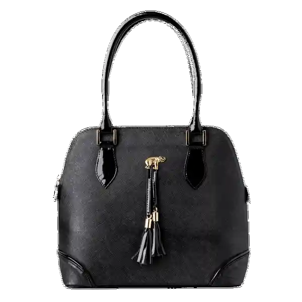 Bolso Negro en cuero texturizado con cremallera y pin de elefante. Es un bolso comodo, liviano y versatil
