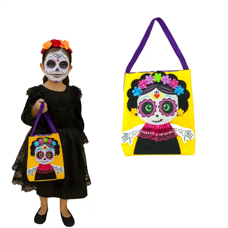 Bolso para Dulces Halloween Día de los Niños Incluye: 1 bolso Diseño: Catrina Material Fieltro Medidas: 25 x 21 cm Características: - Diseños divertidos y coloridos: Cada bolso cuenta con estampados en relieve y detalles llamativos que encantan a los niños. - Asas firmes y cómodas: Ideales para que los pequeños puedan llevar sus dulces sin dificultad. - Versátiles y temáticos: Perfectos para recolectar caramelos en Halloween, usar en fiestas temáticas o incluso como decoración. - Tamaño grande: Con amplio espacio para guardar muchos dulces y sorpresas. Con estas bolsas, tus pequeños disfrutarán de un Halloween lleno de magia y diversión, ¡llevando sus dulces con estilo!