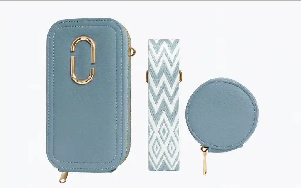 Bolso manos libres portacelular, color azul, tiene doble compartimiento para guardar, incluye monedero y cuerda tejida.