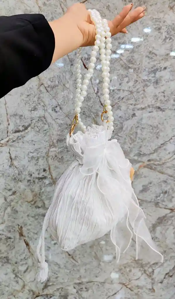 Bolso tipo bucket elaborado en tela plisada , con un acabado suave que aporta movimiento y delicadeza al diseño. Su estructura flexible le da un aire romántico y etéreo, ideal para looks elegantes y femeninos. Incluye cierre ajustable con cordón y un detalle decorativo en tela translúcida que realza su estética. Cuenta con asas de perlas sintéticas sujetas con herrajes metálicos en tono dorado, creando un contraste sofisticado que convierte el bolso en una pieza protagonista.