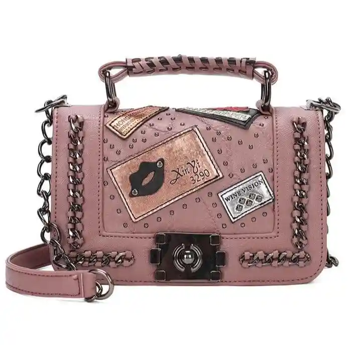 Este es un hermoso bolso estilo rockero, perfecto para cualquier ocasion, con detalles que lo hacen unico, ademas trae una agarradera en la parte posterior y una cadena para que lo uses como desees.