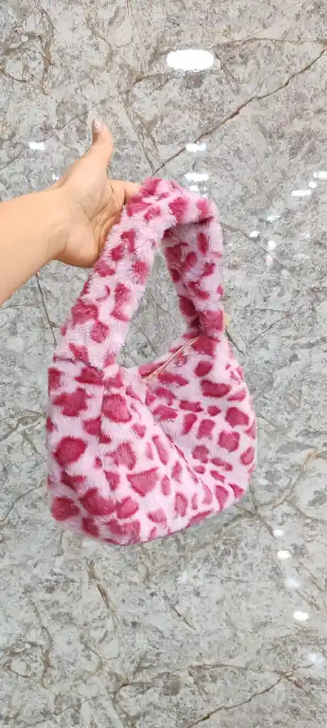 Bolso de material textil afelpado tipo peluche, suave al tacto y con acabado estampado en tonos rosados que aporta un estilo llamativo, femenino y moderno. Su textura es agradable, ligera y cómoda para el uso diario, además de ofrecer un look trendy ideal para destacar cualquier outfit. Usabilidad Cuenta con un diseño compacto y ergonómico, perfecto para llevar al hombro o en la mano. Su tamaño es ideal para guardar lo esencial: celular, billetera, llaves, maquillaje básico y pequeños objetos personales. Es práctico para salidas casuales, citas, eventos informales o uso diario cuando buscas comodidad sin perder estilo.
