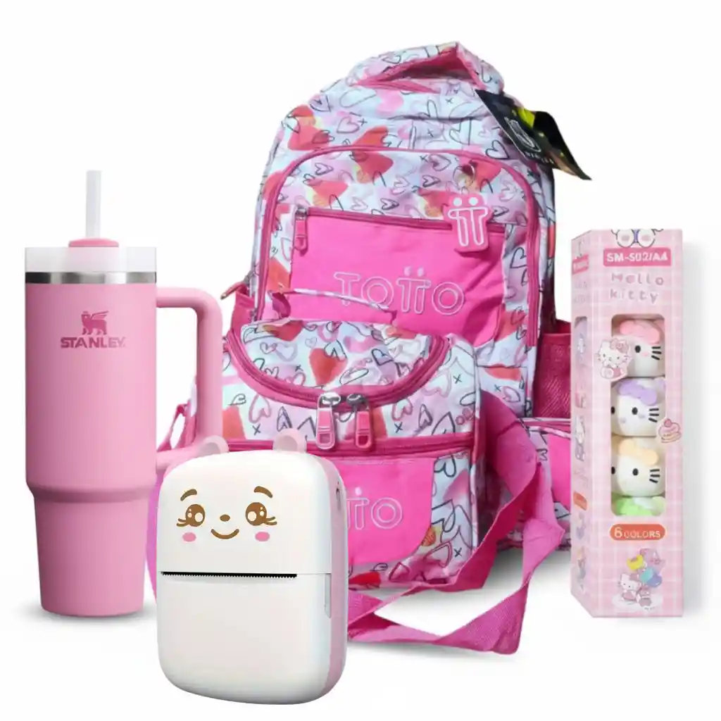 Súper Combo Escolar & Lifestyle – Edición Especial Regreso a Clase Este combo está diseñado para estudiantes y usuarios que buscan funcionalidad, organización y estilo en su día a día. Reúne artículos prácticos para el colegio, la universidad o el trabajo, combinando accesorios escolares con tecnología útil y un diseño moderno. ¿Qué incluye este combo? Set de 3 Bolsos (Genéricos) Conjunto coordinado con diseño estampado, ideal para el uso diario: Mochila: Amplia, resistente y cómoda, perfecta para transportar libros, cuadernos y dispositivos. Lonchera: Con recubrimiento térmico para conservar los alimentos por más tiempo. Cartuchera: Tamaño práctico para organizar útiles escolares y accesorios pequeños. Termo tipo Quencher 40 oz Termo de gran capacidad con asa y pitillo, ideal para mantener bebidas frías durante largas jornadas. Mini Impresora Térmica Portátil Impresora compacta que funciona sin tinta. Permite imprimir notas, recordatorios, etiquetas, imágenes o stickers directamente desde el celular mediante conexión inalámbrica. Set de Resaltadores (5 unidades) Marcadores resaltadores en colores surtidos, ideales para organizar apuntes y material de estudio. Especificaciones del Combo Tipo de combo: Escolar y lifestyle Uso recomendado: Colegio, universidad, oficina y uso diario Cantidad de piezas: 6 artículos Materiales: Textil resistente, plástico y componentes electrónicos (según el producto) Conectividad impresora: Inalámbrica (Bluetooth) Impresión: Térmica (no requiere tinta) Dimensiones Aproximadas del Combo (empacado) Alto total: aprox. 45 cm Ancho total: aprox. 32 cm Profundidad total: aprox. 22 cm Beneficios del Producto Solución completa para estudio y organización diaria Ahorro al adquirir varios productos en un solo combo Ideal para estudiantes de todas las edades Tecnología práctica sin necesidad de consumibles Diseño moderno y funcional Perfecto como regalo o para regreso a clases Garantía Este producto cuenta con 30 días de garantía por defectos de fabricación. Política de Retracto Aplica el derecho de retracto dentro de los 5 días hábiles posteriores a la entrega. El producto debe devolverse sin uso, en perfecto estado y con su empaque original intacto. Nota Importante Para aplicar garantía o retracto se deben enviar fotos y/o videos que evidencien claramente el estado del producto. La garantía no cubre daños por golpes, humedad, mal uso o manipulación indebida.