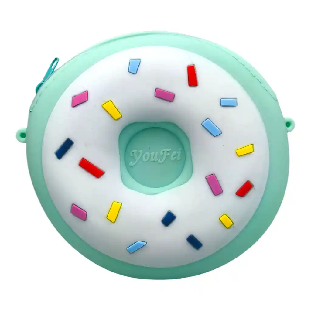 Bolsos en silicona para niñas con forma de dona 🍩✨ Súper suaves, resistentes y fáciles de limpiar. Incluyen correa ajustable con estampados divertidos para colgar al hombro. Disponibles en 4 colores: chocolate, menta, rosado y amarillo. Perfectos para guardar sus tesoros, moneditas o dulces.
