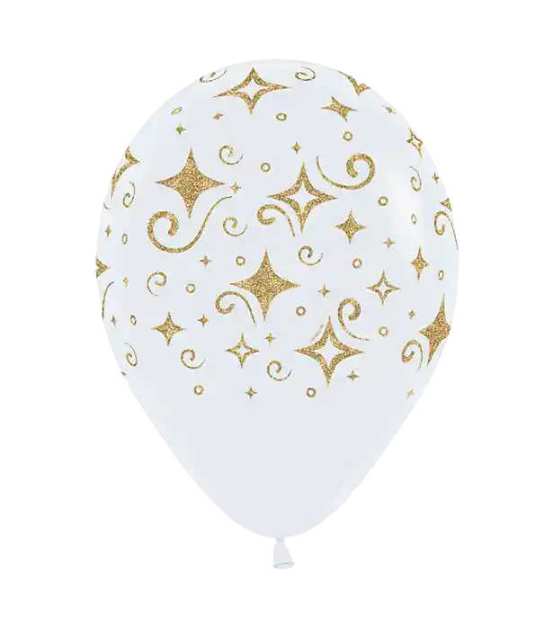 Bombas Blanca Escarchado Diamante Dorado R12.paquete x10 unidades. Si desea inflar sus bombas con helio certificado con flotacion de 3 dias aproximadamente por un costo adicional, puede escribir en el chat del pedido y con gusto le atenderemos.