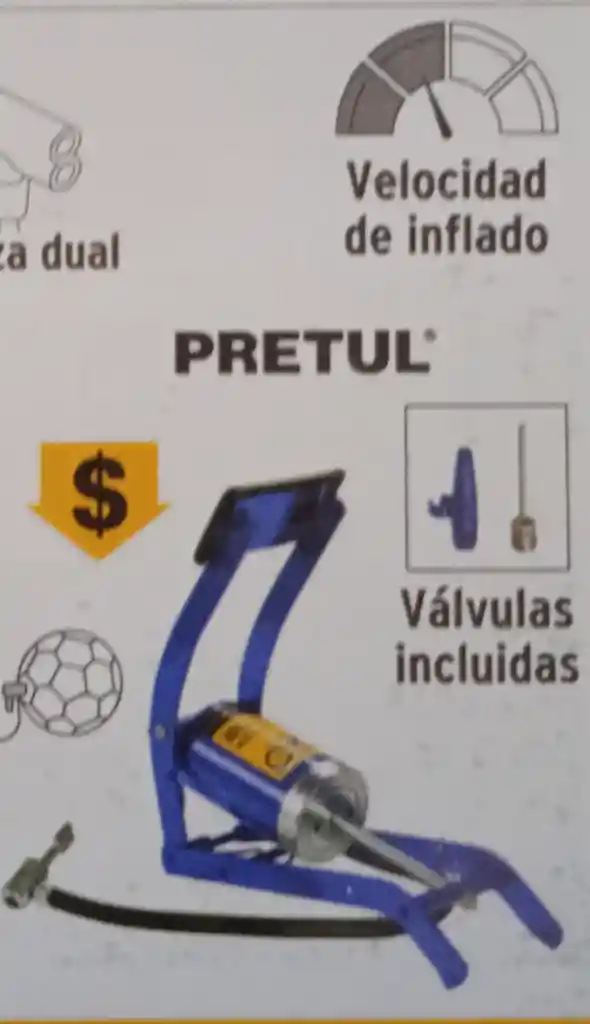 Características: Cilindro de Acero Para Obtener Alta Presión de Aire Conector Reforzado Con Seguro Para Evitar Fugas de Aire Funcionamiento Con Pedal Que Permite Una Mayor Comodidad y Facilita el Inflado Manguera de Pvc y Válvula de Aluminio Usos: Ideal Para Inflar Neumáticos de Bicicletas, Autos, Motocicletas, Balones, Etcétera