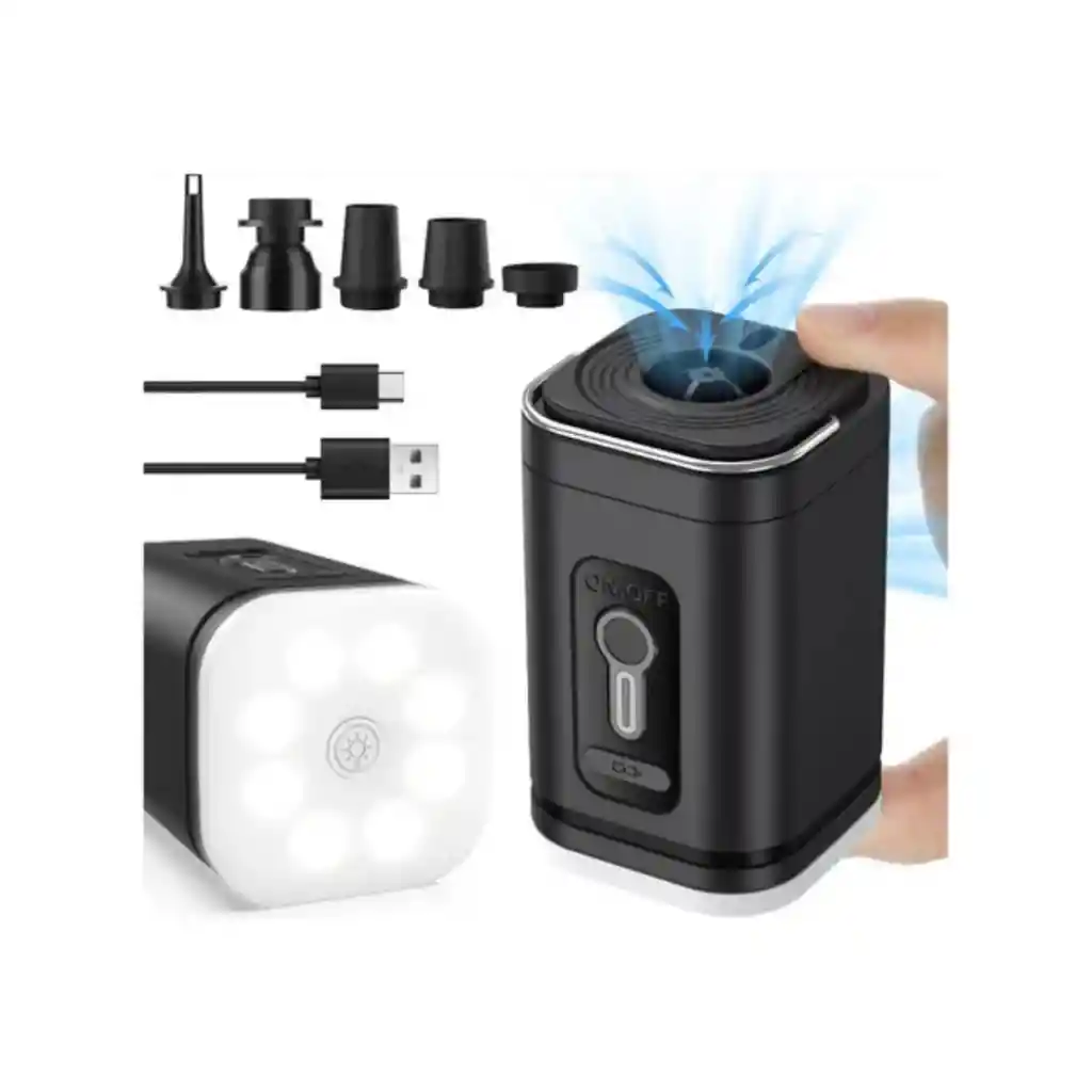 Bomba de aire eléctrica con 5 boquillas, bomba desinfladora infladora Universal con luz, minibomba para juguete inflable para piscina Descripción: [El paquete incluye]: Cada compra viene con 1 bomba infladora, 5 boquillas, 1 cable de carga y 1 bolsa de almacenamiento. [Inflador y desinflador rápidos]: Diseños de bombas de aire eléctricas con alta eficiencia, fácil y rápido, que ahorran tiempo, no solo inflando sino también desinflando. [5 boquillas para elegir]: Tenemos 5 boquillas de diferentes tamaños en la bomba de aire eléctrica, que pueden adaptarse a la mayoría de los productos inflables que necesita para inflar o desinflar. Tamaño compacto que se guarda fácilmente en su mochila o bolsillo. [Doble funcionalidad]: el producto sirve como bomba infladora y como luz para acampar al aire libre, lo que lo convierte en ideal para los entusiastas de la vida al aire libre. También cuenta con dos niveles de iluminación para atender diferentes necesidades. [Uso versátil]: Nuestra bomba de aire es adecuada para la mayoría de los diferentes tipos de productos aireados, como flotadores de piscina, colchones de aire, camas de aire, botes, muebles inflables, anillos de natación y más.