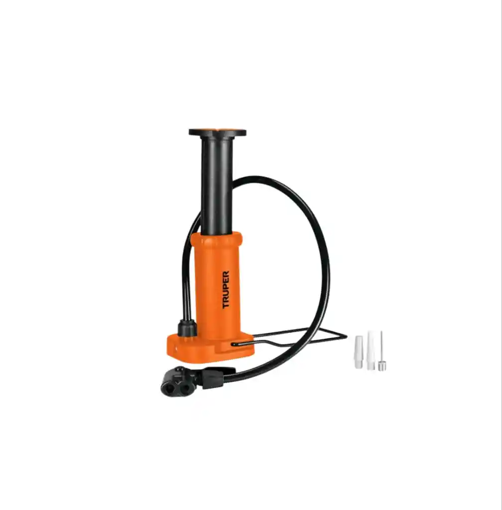 DESCRIPCION Cuerpo de polipropileno Cabeza dual que permite el uso de válvulas europea (Presta), americana (Schrader) y Dunlop Diseño compacto Compartimento para almacenar válvulas y pedal antiderrapante Incluye válvulas para inflables y balones Presión máxima 60 PSI (413 kPa) Longitud 12 cm Longitud total 23 cm Diámetro 45 mm (1 3/4") Largo de manguera 49 cm