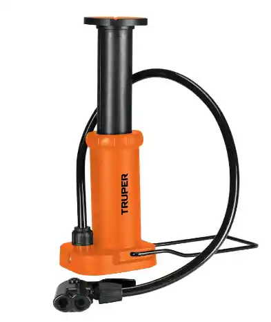 Cuerpo de polipropileno Cabeza dual que permite el uso de válvulas europea (Presta), americana (Schrader) y Dunlop Diseño compacto Compartimento para almacenar válvulas y pedal antiderrapante Soporte metálico abatible 90°