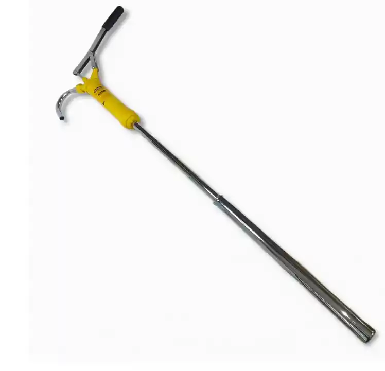 BOMBA EXTRACTORA CON PALANCA PARA ACEITES Estas bombas están diseñadas y para una rápida transferencia de lubricantes, disolventes, productos químicos agrícolas e industriales, aditivos y otros líquidos no corrosivos en tambor de 15 hasta 55 galones. CARACTERISTICAS • Flujo: 20L/min • Montaje: Tuerca tapón 2" y 1. 1/2" NPT • Mango de vinilo acolchado • Tubería telescópica ajustable de fácil desmonte • Dispensa 300 cc aproximadamente de líquidos por bombeo • Ideal para lubricantes y aceites grado de viscosidad hasta ISO VG 100 • Marca UYUSTOOLS NOTA: Lea atentamente las instrucciones antes de usar la bomba.