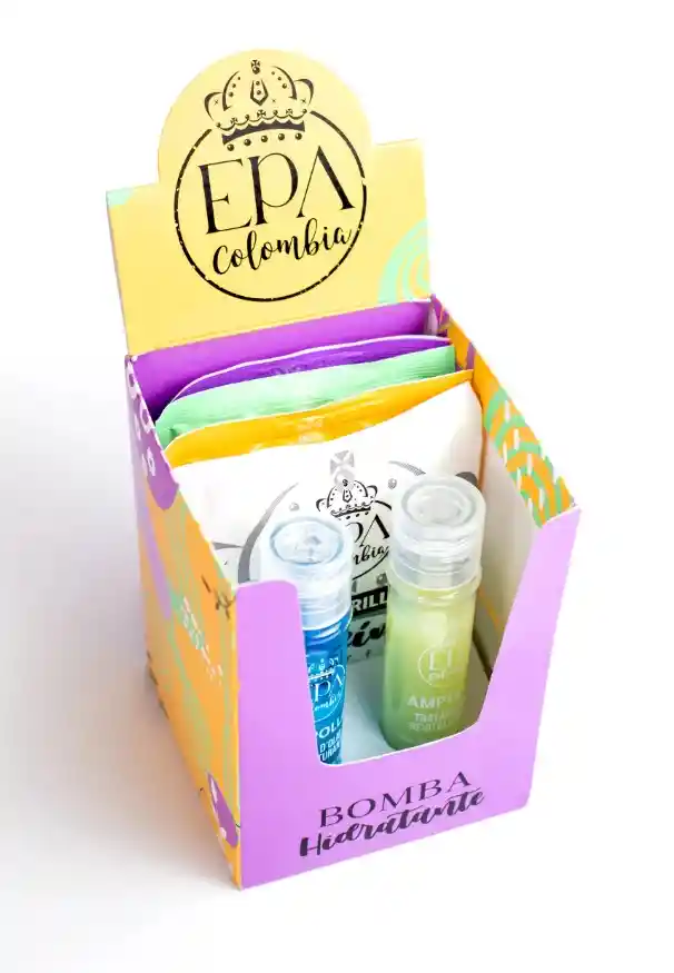 Espectacular bomba Hidratante de Epa Colombia Cada bomba contiene 4 Sachet mascarilla de 25ml c/u: - MASCARILLA KERATINA: 💚 Reestructurarte - MASCARILLA AGUACATE: 🥑 Hidratante - MASCARILLA PROTEINA DE ARROZ: 🍙 Revitaliza, nutre y suaviza - MASCARILLA REPARADOR: ✨ Restructurante 2 ampolletas de 13ml c/u: - Ampolleta amarilla: Revitalizante - Ampolleta azul: Restructurante