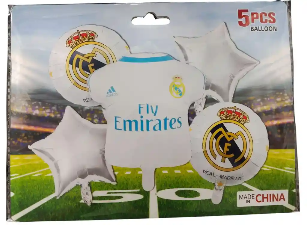 BOMBAS GLOBOS POR 5 PIEZAS DISEÑO FUTBOL EQUIPO REAL MADRID PARA DECORACION DE FIESTAS NIÑO O HOMBRE O MUJER