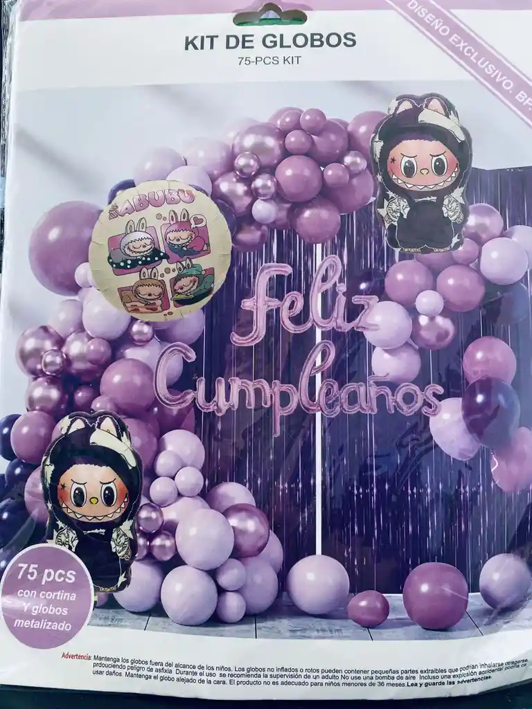 BOMBAS GLOBOS POR 75 PIEZAS TIPO ARCO FELIZ CUMPLEAÑOS COLORES DISEÑO LABUBU COLORES MORADO OSCURO Y LILA PARA DECORACION DE FIESTAS NIÑO, HOMBRE Y MUJER