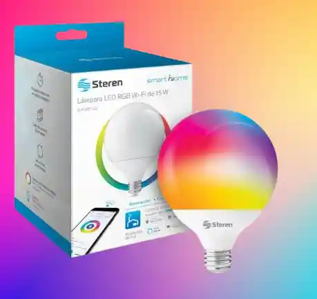 Foco Bombillo LED Wi-Fi Multicolor RGB 15 W Steren ==== Descripción ==== Iluminación multicolor. Controla el encendido, apagado y matices desde la palma de tu mano. • El foco se vincula por Wi-Fi a tu modem • Puedes sincronizarlo a más de un celular • Incorpora iluminación fría independiente • Bajo consumo: 15 watts • Compatible con Android y iPhone • Compatible con Amazon Alexa* y Google Assistant* • Función temporizador (timer) • Incorpora secuencias de iluminación programadas • Compatible con cualquier socket estándar Convierte tu casa en una Smart Home y ambienta sus espacios con una intensa iluminación multicolor! Luz multicolor: Se adapta perfectamente a cualquier tipo de situación, ya que es posible iluminar con miles de matices. Luz fría: Incorpora luz fría independiente, ideal para espacios dinámicos o de trabajo. Conexión Wi-Fi*: La lámpara se vincula por Wi-Fi en redes de 2,4 GHz, lo que asegura gran alcance inalámbrico. Compatibilidad: Se coloca en cualquier socket estándar (E27), por lo que no será necesario hacer modificaciones en tu instalación; solo cámbialo por cualquier foco. App Steren Home: Su uso se administra por medio de nuestra app Steren Home, desde donde puedes cambiar el color de la iluminación, controlar el encendido y apagado instantáneo o por prograMachorarios y rutinas, compartir el control con otros usuarios y mucho más. Control por voz: Es compatible con los asistentes Alexa* y Google Assistant * que te dan comodidad de uso dentro de tu hogar, al activar o desactivar la lámpara con tu voz. Bajo consumo: Consume solamente 15 W, pero ilumina como un foco incandescente de 100 W Descripción técnica Conexión Wi-Fi Luz RGB Control con más de un celular Compatible con Alexa* y Google Assistant* App: Steren Home Encendido instantáneo Omnidireccional Uso en interiores Terminal E27 “No debe usarse con atenuadores de luz” Especificaciones Voltaje de operación: 100 a 240 V˜ 50/60 Hz 0,125 A Potencia: 15 W Flujo luminoso: 1 500 lm (luz de día) Tiempo de vida: 15 000 h Frecuencia Wi-Fi: 2,4 GHz Estándar: IEEE 802.11 b/g/n