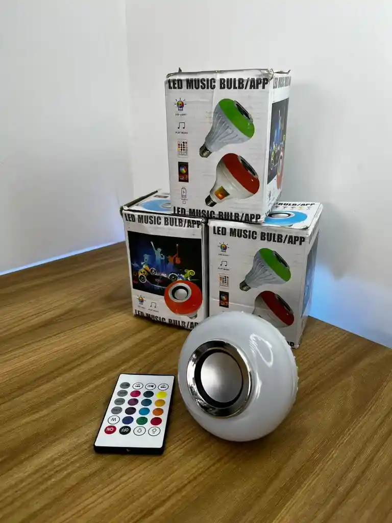 Bombillo LED Parlante Bluetooth Control Remoto RGB Bombillo LED con parlante Bluetooth integrado, que combina iluminación y música en un solo dispositivo. Controla la luz y la música de forma inalámbrica mediante Bluetooth, con un volumen ajustable para ambas funciones. Características: • Bombillo LED con altavoz Bluetooth integrado • Control inalámbrico vía Bluetooth • Cambia colores de luz con el control remoto