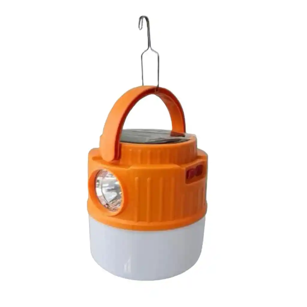 LAMPARA SOLAR JY901 •Recargable tipo USB y solar Con doble agarre gancho y asa •Tipo de luz: Fría •Colores: Naranja y azul
