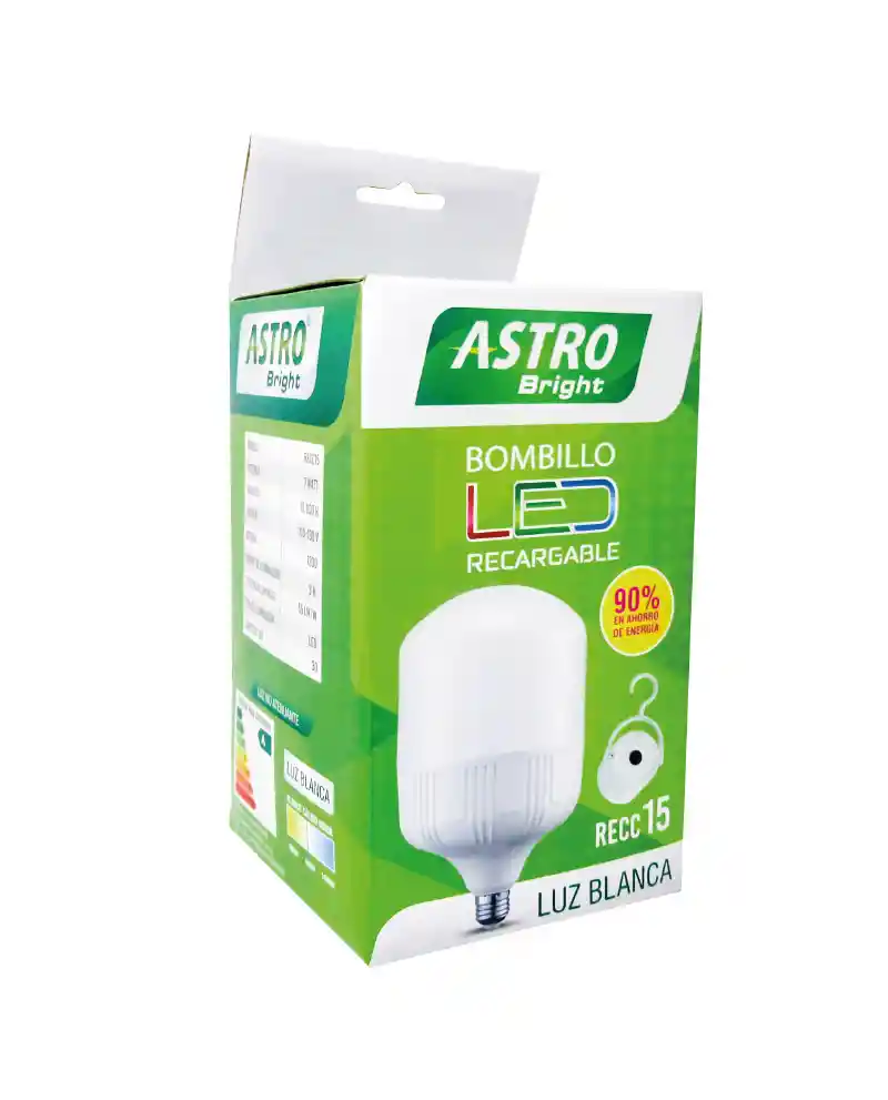 Luz LED blanca. 90% en ahorro de energía. 10.000 horas de duración. Gancho plegable para colgar. 3 horas de duración. Posee rosca convencional.