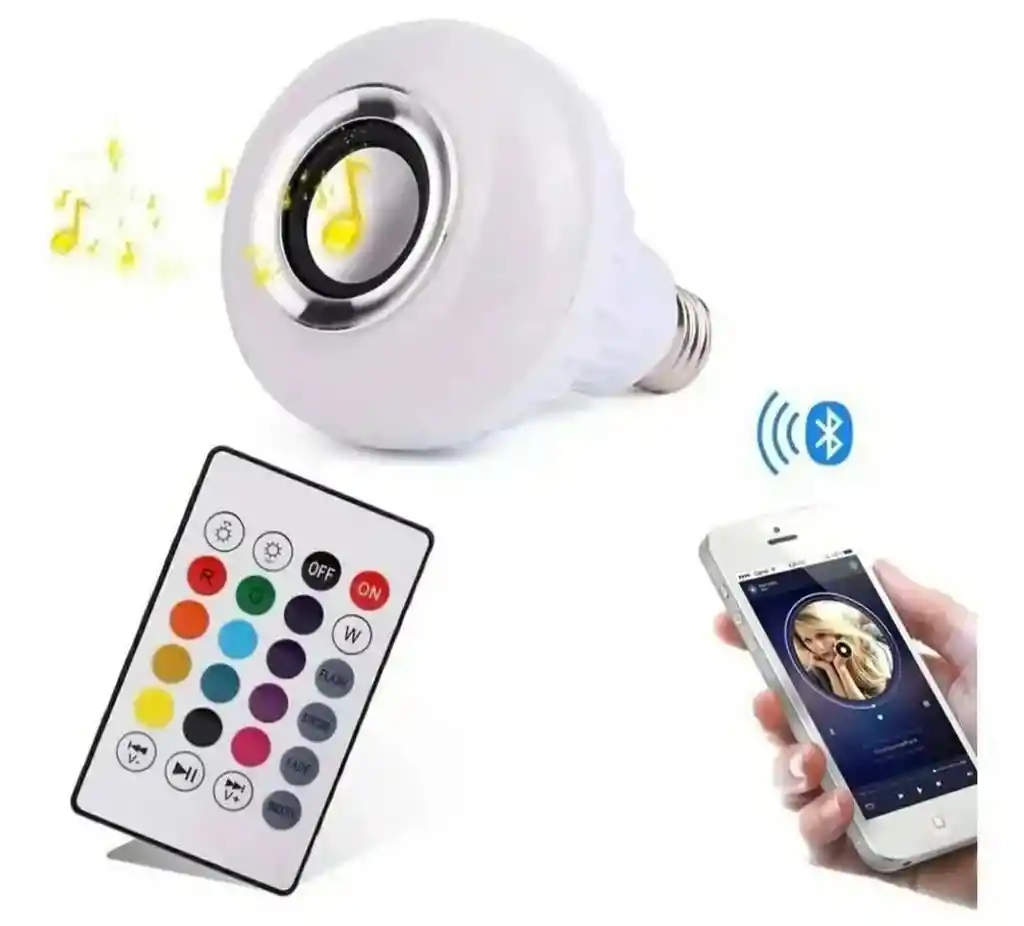 Especificación:- Interfaz E27- Voltaje de trabajo AC100V-240V/50-50Hz- Potencia 12W- Potencia LED 7W- Potencia de altavoz 3W- Respuesta del altavoz 3W- Respuesta de frecuencia 135 Hz a 15KHz- Versión inalámbrica 4.2- Configuración de soporte A2DP- Gama de radio 10m (33ft)- Color de luz RGB 16 color con el mando- Amplificador Clase D- Gama de radio: 10m (33ft)- Entrada de señal: Bluetooth- Tamaño: L x W x H: 9.4 x 9.4 x 13 cmEl paquete incluye:- 1 lámpara LED con parlante y bluetooth- 1 control remoto (incluye batería CR2032)Funciones del control:- Cambia a 13 colores incluyendo el blanco- Puedes subir o bajar el brillo a la luz- Puedes subir o bajar volumen- Puedes avanzar o retroceder canciones- 4 diferentes velocidades de luz- Se puede dejar la luz apagada y seguir reproduciendo la música. tiene botón de encendido y apagadoContenido del paquete- 1 Bombillo parlante- 1 Control RGB