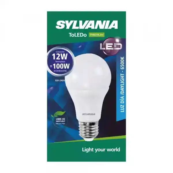 BOMBILLO TOLEDO LED X 12 W SYLVANIA ROSCA: E27 LED TOLEDO CARACTERISTICAS • Bombilla LED en formato bulbo para iluminación domestica, su tecnología y diseño proporciona una mejor iluminación interior. • Ahorra hasta el 90% de energía comparado con bombillas incandescentes. • Cuerpo con acabado opalizado. • Tecnología de chip LED SMD. • Tipo de distribución: Directo Simétrico. • Parámetros Eléctricos bajo Norma IEC 62612.