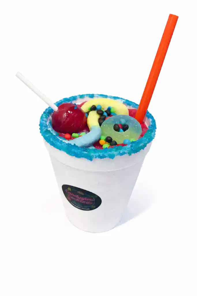 Bebida granizada con licor, incluye 3 gomas, 1 Bombombum y escarchado de Okaloka