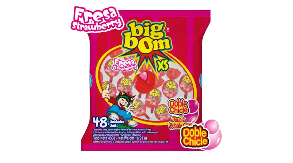 El Bombón Big Bom Fresa XS en presentación de 48 unidades es un caramelo duro tipo chupeta con relleno de chicle y sabor intenso a fresa. Cada unidad es de tamaño pequeño y viene empacada individualmente, lo que facilita su transporte y porcionado. Su combinación de exterior dulce y centro masticable lo convierte en un snack ideal para compartir, regalar o disfrutar en cualquier momento del día. Se recomienda conservarlo en un lugar fresco y seco para mantener su frescura y sabor duradero.