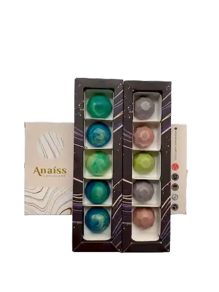 Linea Agua: Elaborados Completamente En Chocolate Blanco; Rellenos De Ganache De Coco. Linea Aire: Elaborados Con Chocolate 85% Cacao; Chocolate Blanco y Rellenos De Frutos Rojos.
