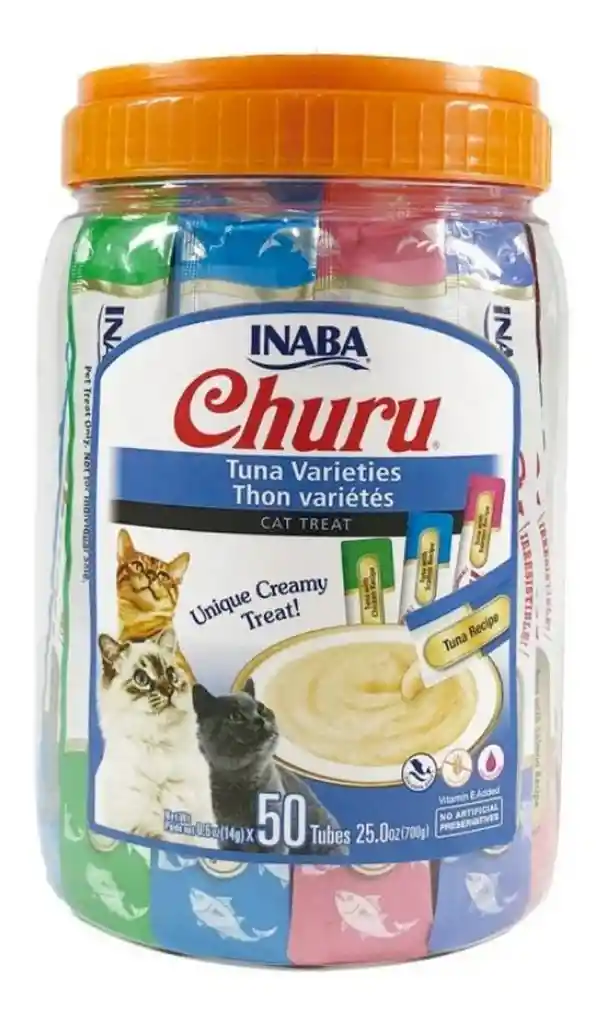 CONTIENE: Receta Atún x20 Tubos Agua, atún, almidón de tapioca, aromas naturales, goma guar, sabor natural de atún, suplemento de vitamina E, taurina, extracto de té verde. Receta Atún con Pollo x10 Tubos Agua, atún, pollo, almidón de tapioca, saborizantes naturales, goma guar, sabor natural de atún, suplemento de vitamina E, taurina, extracto de té verde. Receta Atún con Vieiras x10 Tubos Agua, atún, almidón de tapioca, vieira, sabor natural de vieira, sabores naturales, goma guar, suplemento de vitamina E, taurina, extracto de té verde. Receta Atún con Salmón x10 Tubos Agua, atún, salmón, almidón de tapioca, aromas naturales, sabor natural de atún, goma guar, suplemento de vitamina E, taurina, extracto de té verde. HECHO CON INGREDIENTES SALUDABLES: Cada producto Inaba está hecho con ingredientes de alta calidad, incluido pollo criado en granjas y/o atún silvestre natural. MANTENGA A SU FELINO HIDRATADO SIN AGREGAR CALORÍAS: Cada tubo de Churu contiene un 91 % de humedad y solo seis calorías, lo que lo conv
