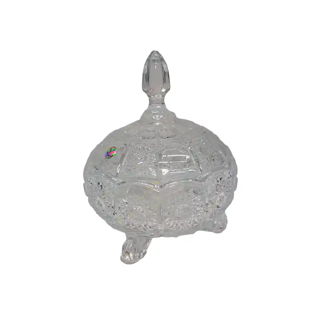 Cristal murano genuino: elaboración artesanal veneciana, garantía de un vidrio de la más alta calidad y pureza.. Tamaño grande de impacto: pieza ideal para convertirse en el punto focal de mesas de centro, buffets o aparadores.. Diseño elegante con patas: base elevada que proporciona sofisticación y un look clásico a la bombonera.. Cristal fino con tallado artesanal: superficie con detalles tallados que maximizan el brillo y el reflejo de la luz.. Capacidad Amplia: Perfecto para almacenar una gran cantidad de dulces, potpourri o artículos decorativos.. Tapa con acabado detallado: protege el contenido del polvo y la humedad, manteniendo su frescura y valor.. Transparencia cristalina superior: permite una visualización nítida y atractiva de los objetos que contiene.. Base sólida y segura: su estructura garantiza estabilidad, incluso cuando está completamente llena.. Fácil de integrar: su estilo clásico y material neutro combinan con cualquier esquema de decoración interior.. Fácil limpieza: el cristal liso permite mantener su resplandor con un simple paño suave y húmedo.