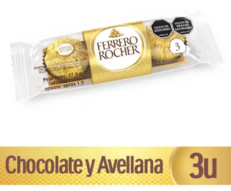 Tripack chocolates Ferrero Rocher. Marca: Ferrero Rocher. Características: Tres chocolates. Almacenamiento: Consérvese en un lugar limpio, fresco y seco, despúes de abierto consúmase en el menor tiempo posible.