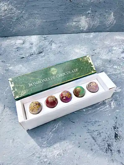 Contiene 5 bombones con diseños únicos y rellenos de: macadamia, café caramelo, maracuyá, ganache de frutos rojos.