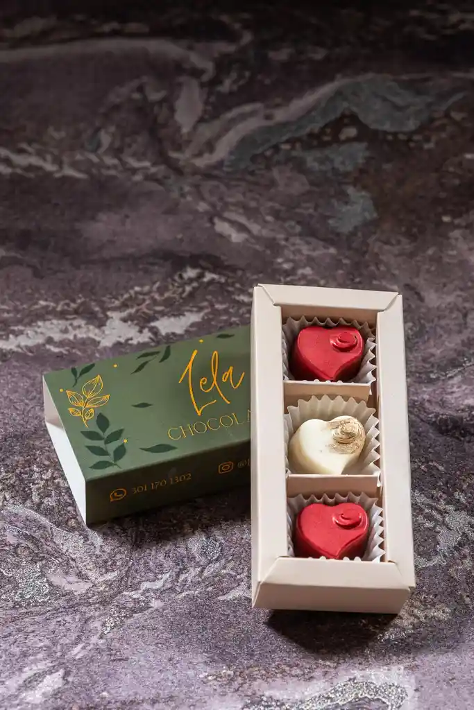 Caja de chocolates artesanales elaborados en chocolate semiamargo y blanco rellenos de fresa y arequipe En elegante caja de regalo decorada con lazo en cinta tela