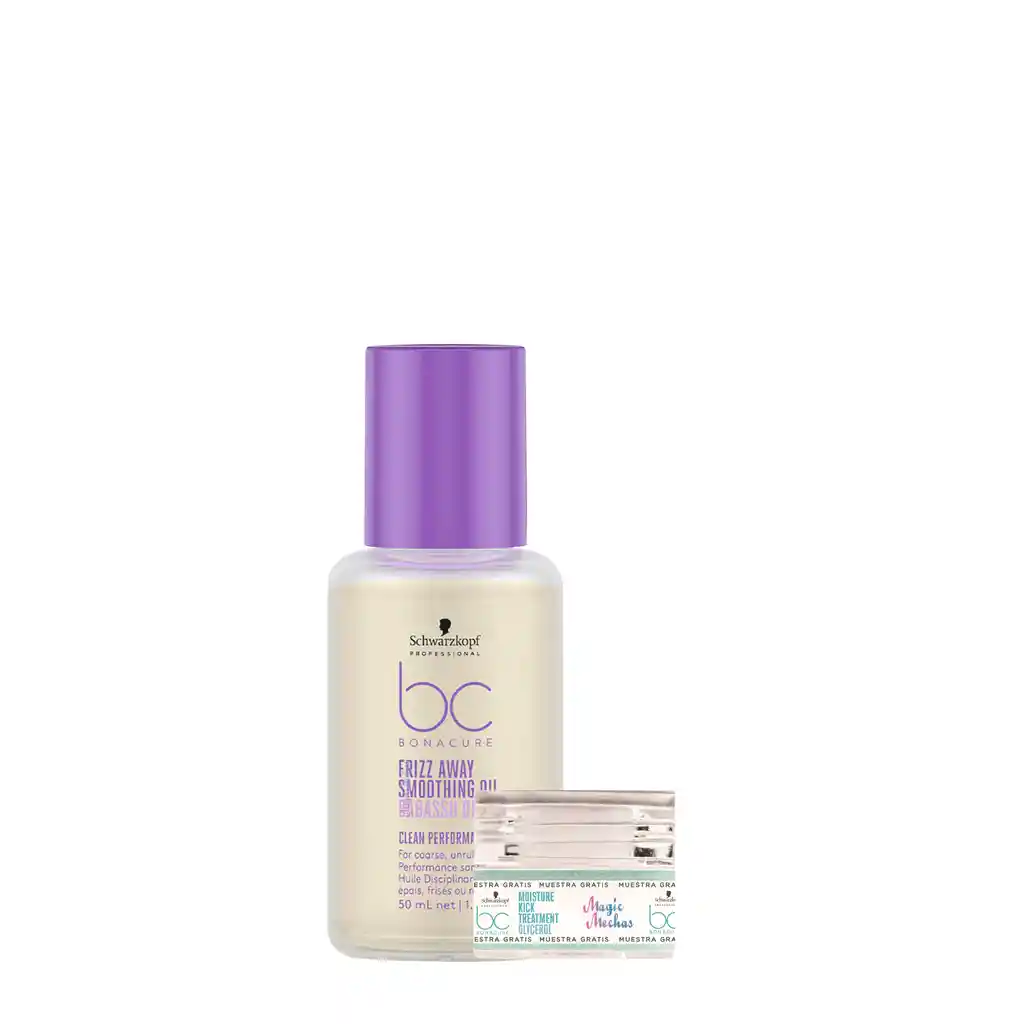 Bonacure Frizz Away Smoothing Oil 50mL Bonacure Frizz Away Aceite Suavizante, es un aceite para el cabello, intensivo y concentrado que protege frente a la humedad. Este aceite concentrado, especialmente formulado para cabello rebelde, grueso y encrespado, suaviza la superficie capilar, controla el encrespamiento hasta 72h y protege frente a los efectos que produce la humedad hasta 48 horas. Beneficios: Aceite intensamente concentrado con una acción desenredante que deja el cabello liso y suave. Controla el encrespamiento hasta 72 horas. Protege frente a la humedad hasta 48 horas. Protección térmica hasta 210°C. Modo de uso: Aplicar una pequeña cantidad del aceite sobre el cabello húmedo o seco. No enjuagar. Nota: Por la compra recibe como obsequio una muestra gratis de la mascarilla Moisture Kick Glycerol.