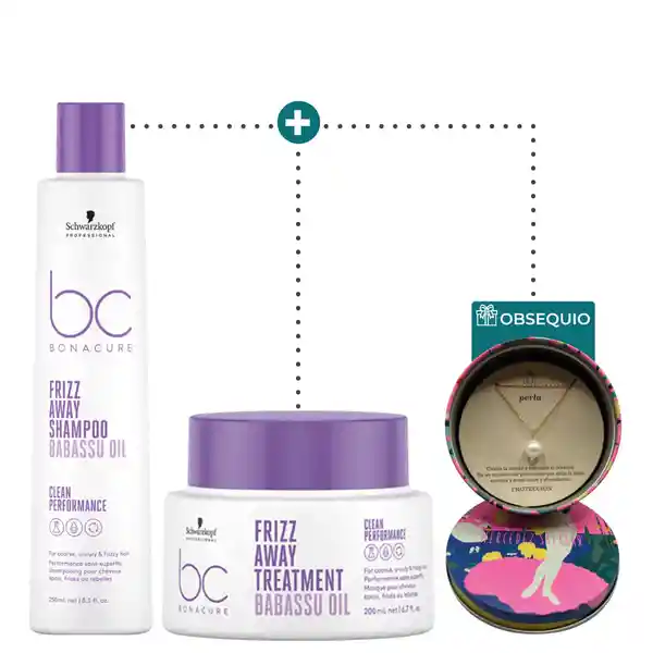 Kit Contiene 2 Unidades. Shampoo 250 mL + Tratamiento 200 mL + Obsequio Gratis 1 Und. Te Invitamos a Descubrir el Kit de Cuidado Antifrizz de Bonacure by Schwarzkopf Professional Especialmente Diseñado Para Controlar el Frizz y Suavizar el Cabello Rebelde. Este Exclusivo Set Incluye un Shampoo Frizz Away y un Tratamiento Frizz Away Con la Innovadora Tecnología Vegan Care Complex y Aceite de Babasú Que Nutre Profundamente y Disciplina el Cabello Sin Apelmazarlo. Proporciona Hasta 72 Horas de Control Del Frizz Dejando el Cabello Suave Manejable y Con un Brillo Saludable. Todos Los Productos Son de Fórmula Vegana Libres de Sulfatos Sls/Sles Siliconas y Colorantes Artificiales Garantizando un Cuidado Delicado y Efectivo. Además Como Detalle Especial te Obsequiamos Una Elegante Cadena de Perla de Mercedes Salazar! Dale a tu Cabello el Cuidado Que Merece y Disfruta de un Look Impecable en Cualquier Momento.