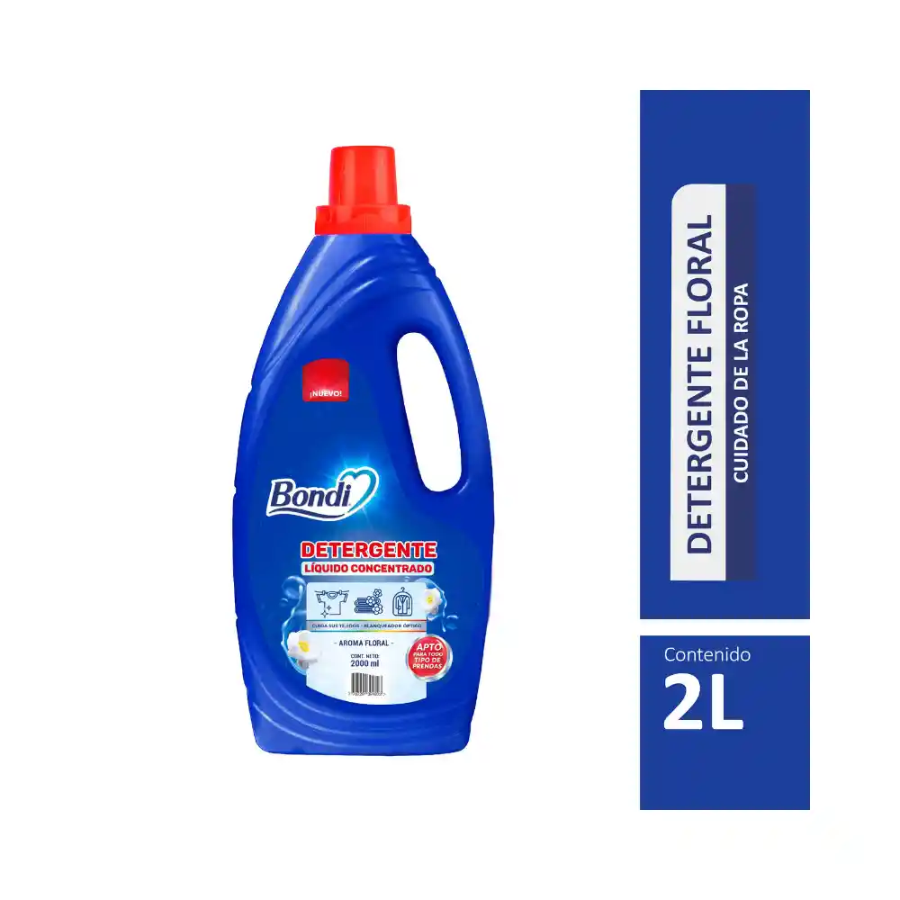 Detergente Liquido 2000mL - DETERGENTE LÍQUIDO concentrado, con blanqueadores ópticos para el lavado de prendas blancas y de color. Apto para todo tipo de prendas. No contiene fosfatos. - Presentaciones: 2000ml - Fragancias: Floral - Contiene Blanqueador Óptico, Cuida sus tejidos, no contiene fosfatos.