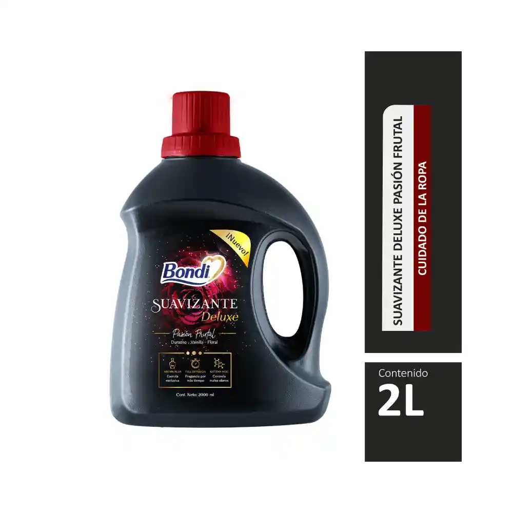 Suavizante Deluxe Bondi 2000ml - Ideal para aromatizar tus prendas por más tiempo con fragancias dulces y frescas inspiradas en notas cremosas que protegen de los malos olores. - Diluya 100 ml del producto en agua y vacíelo en el último ciclo de enjuague de la lavadora. Para el lavado manual sumerja las prendas durante diez minutos. Recuerde utilizar más suavizante en cargas grandes de ropa. - Fragancias: Pasión frutal, Brisa silvestre, Jardín de ensueño. - Presentaciones: 2.000ml. - Agentes suavizantes y estabilizantes.