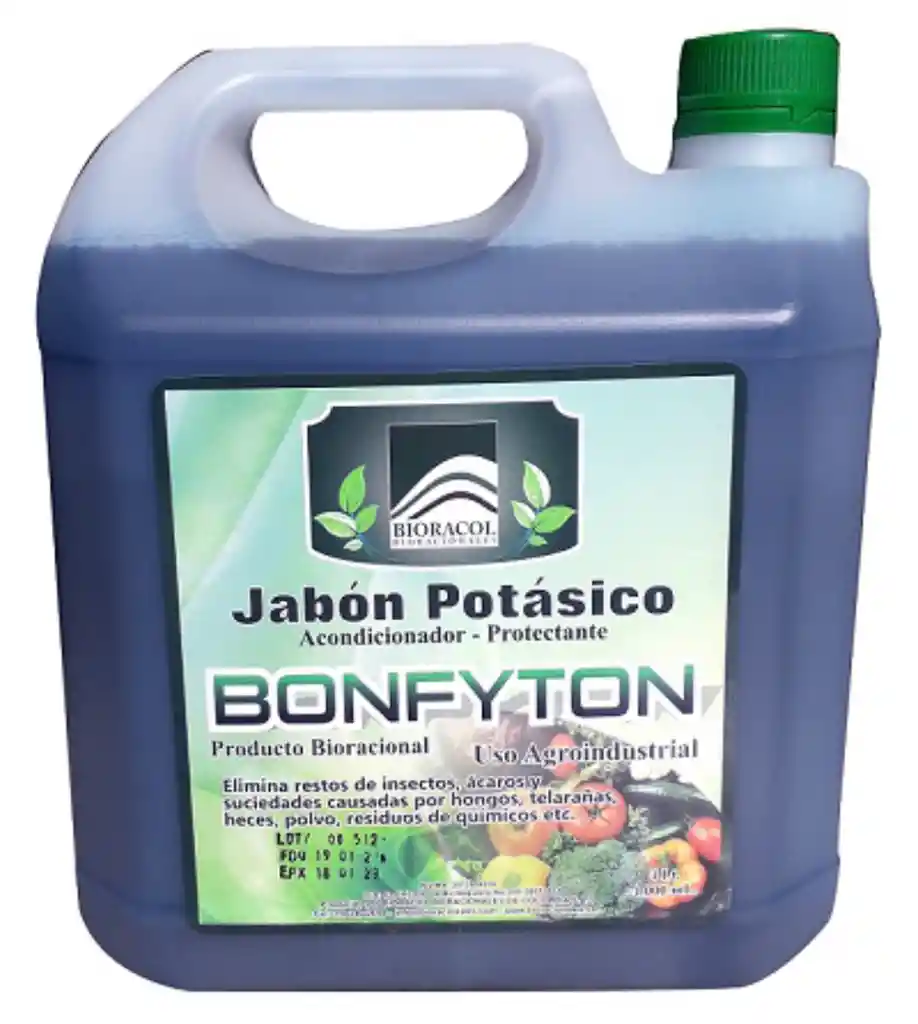 "BONFYTON JABÓN POTÁSICO Sales potásicas de Ácidos grasos con d-limoneno, controlador de Plagas de Cuerpo blando, Ácaros, Áfidos y Moscas blancas (Palomillas) y limpiador de Fumagina y suciedades causadas por polvo, residuos de químicos y restos de insectos. BONFYTON es un Jabón Potásico formulado a partir de Ácidos grasos, Dipentenos, Tensoactivos, Álcalis potásico y Surfactantes de origen natural que dan lugar a un producto Biorracional, ambientalmente amigable y libre de sustancias perjudiciales como Sodio, Fenoles y Óxido de etileno. Es totalmente soluble en agua, de fácil aplicación y de uso regular en el control de plagas de cuerpo blando y en el mejoramiento del aspecto estético y de limpieza de Flores, frutas, verduras, legumbres y hortalizas. Para uso en el lavado de focos de plagas de cuerpo blando como ácaros (arañitas), áfidos (pulgones) y mosca blanca (palomillas), en la limpieza de productos vegetales y agrícolas en general sin alterar su calidad o duración. En la cosecha, el transporte, almacenaje y manipuleo de productos agrícolas que han adquirido suciedades como polvo, residuos de productos plaguicidas y restos de insectos, hongos y bacterias y un sin número de organismos que serán perjudiciales para la estética y calidad del producto. Retira eficientemente la fumagína y otros hongos, azucaramientos causados por áfidos, exuvias, mudas, telarañas, polvo, residuos de plaguicidas y otras suciedades. "