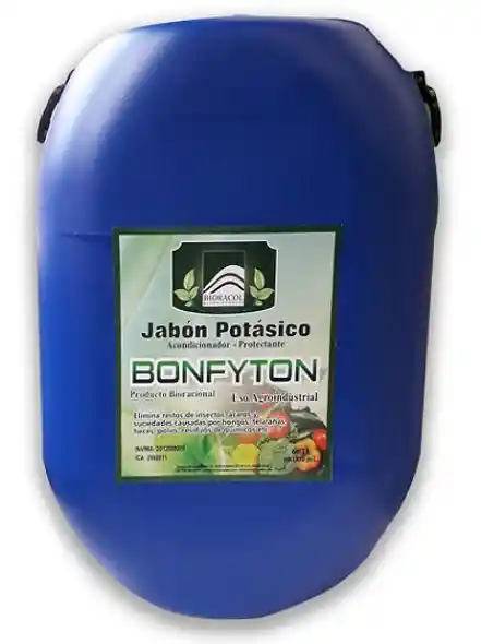 "BONFYTON JABÓN POTÁSICO Sales potásicas de Ácidos grasos con d-limoneno, controlador de Plagas de Cuerpo blando, Ácaros, Áfidos y Moscas blancas (Palomillas) y limpiador de Fumagina y suciedades causadas por polvo, residuos de químicos y restos de insectos. BONFYTON es un Jabón Potásico formulado a partir de Ácidos grasos, Dipentenos, Tensoactivos, Álcalis potásico y Surfactantes de origen natural que dan lugar a un producto Biorracional, ambientalmente amigable y libre de sustancias perjudiciales como Sodio, Fenoles y Óxido de etileno. Es totalmente soluble en agua, de fácil aplicación y de uso regular en el control de plagas de cuerpo blando y en el mejoramiento del aspecto estético y de limpieza de Flores, frutas, verduras, legumbres y hortalizas. Para uso en el lavado de focos de plagas de cuerpo blando como ácaros (arañitas), áfidos (pulgones) y mosca blanca (palomillas), en la limpieza de productos vegetales y agrícolas en general sin alterar su calidad o duración. En la cosecha, el transporte, almacenaje y manipuleo de productos agrícolas que han adquirido suciedades como polvo, residuos de productos plaguicidas y restos de insectos, hongos y bacterias y un sin número de organismos que serán perjudiciales para la estética y calidad del producto. Retira eficientemente la fumagína y otros hongos, azucaramientos causados por áfidos, exuvias, mudas, telarañas, polvo, residuos de plaguicidas y otras suciedades. "