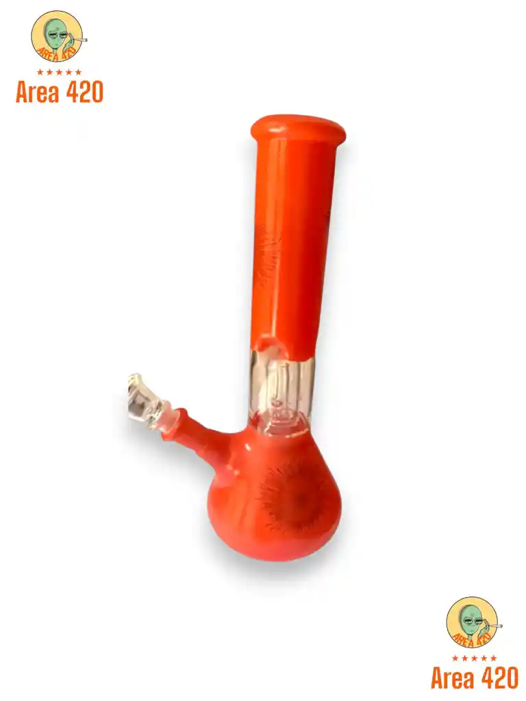 Este bong es un accesorio de vidrio artístico soplado, con diseño curvo estilo “cuello de cisne” y base redonda tipo esfera. Tiene detalles en tonos rojos y dorados que le dan un acabado elegante y llamativo. 🔥