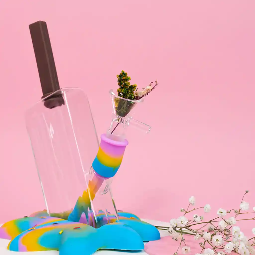 ¡Experimenta una nueva sensación en el mundo de la weed con nuestro bong de silicona y vidrio en forma de helado! Tamaño: 12.7*19CM COLORES MORADO Y AZUL