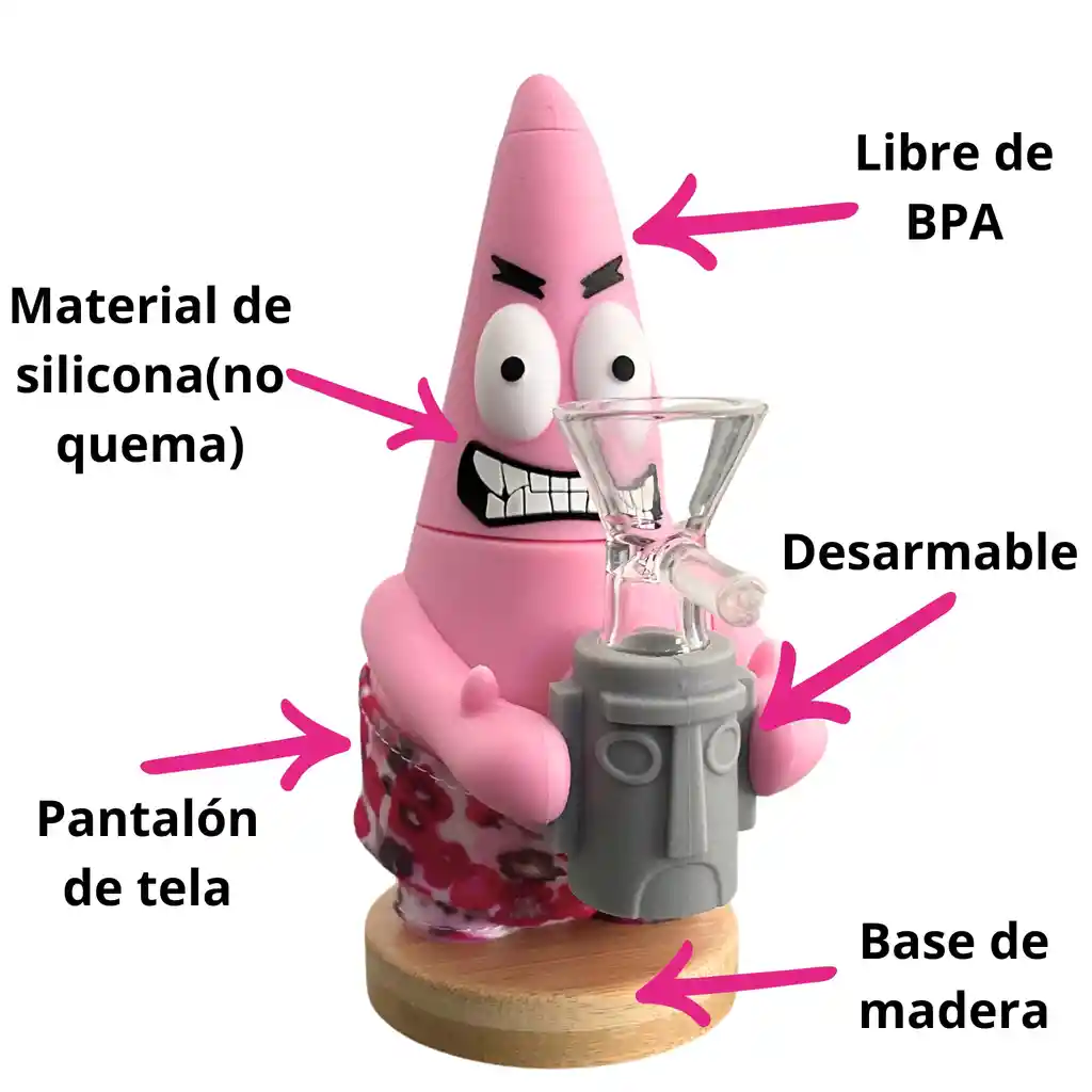 Pipa de Agua - Bong en silicona y boquilla de Vidrio Diseñado con la forma de Patricio, este bong agrega un toque de diversión a tus sesiones. Materiales: La silicona proporciona durabilidad y resistencia, mientras que la boquilla de vidrio garantiza un sabor puro y limpio. Base de bambú y ropa en tela La silicona es fácil de mantener y la boquilla de vidrio se desmonta para una limpieza sencilla, manteniendo tu bong en óptimas condiciones. Tamaño: - 15 Cm de Alto - 9 Cm de diamtreo