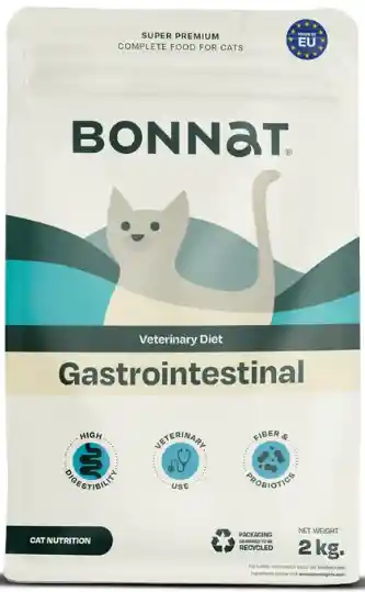 Beneficios Descripción Presentamos una dieta veterinaria específicamente diseñada para gatos de todas las edades, con el propósito de brindar soporte en el manejo de síntomas y enfermedades relacionadas con el sistema gastrointestinal. Esta fórmula trabaja para proteger tanto el sistema digestivo como los órganos anexos. La recomendación sobre el uso y la duración de esta dieta será determinada por el médico veterinario tratante, quien considerará las necesidades individuales de cada gato.