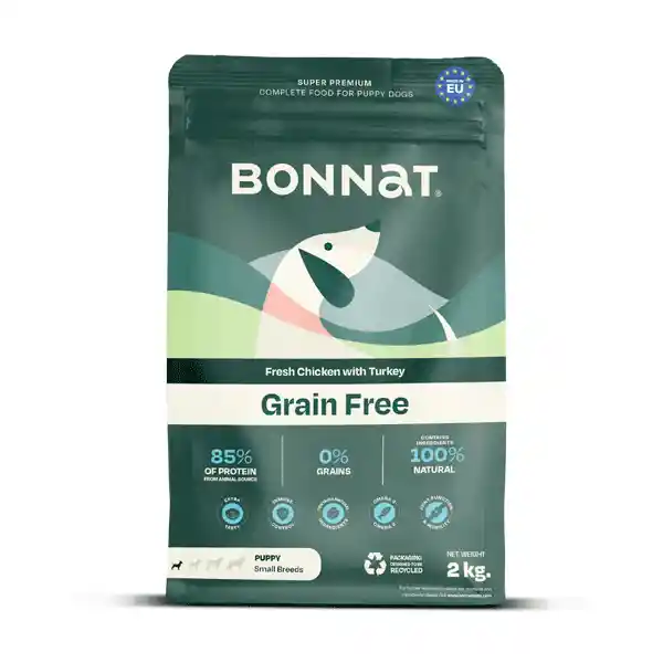 Alimento Super Premium completo y balanceado, para perros cachorros de tamaños pequeños desde el destete hasta los 12 meses, pertenece al segmento holístico y natural. Sin granos incluidos, con carnes magra de pollo y pavo, con ingredientes 100% naturales, 85% de proteínas de origen animal, alto en probióticos SF68, sin colorantes, saborizantes o conservantes artificiales