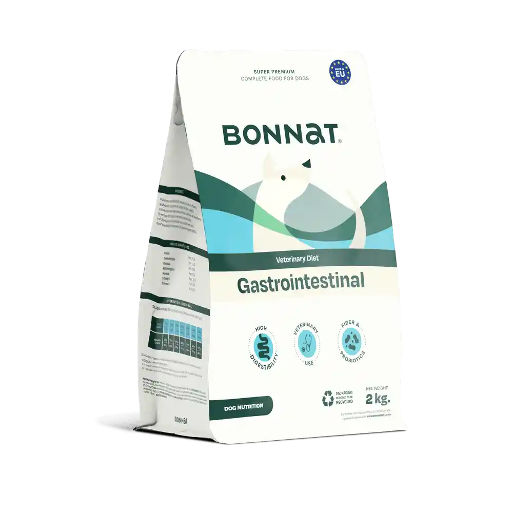 Referencia: BONNAT CANINE VETERINARY GASTROINTESTINAL X 2 KG Descripción: Bonnat Canine Veterinary Gastrointestinal es un alimento especializado para perros con trastornos digestivos, formulado para favorecer la salud intestinal y mejorar la absorción de nutrientes. Su fórmula altamente digestible ayuda a reducir los problemas gastrointestinales como diarrea, vómitos y malabsorción, proporcionando una nutrición equilibrada y de fácil asimilación. Beneficios: Fórmula altamente digestible: Ingredientes seleccionados para una mejor absorción y menor carga digestiva. Bajo en grasa y fibra moderada: Ayuda a estabilizar el tránsito intestinal y prevenir problemas digestivos. Prebióticos y probióticos: Contribuyen a equilibrar la flora intestinal y fortalecer el sistema inmunológico. Ácidos grasos esenciales (Omega 3 y 6): Favorecen la salud intestinal y reducen la inflamación. Antioxidantes naturales: Apoyan la recuperación y fortalecen el sistema inmunológico. Composición principal: Proteínas altamente digestibles como el pollo y el pescado. Arroz y almidones de fácil asimilación para una digestión suave. Fibras solubles e insolubles para regular el tránsito intestinal. Dosis recomendada: La cantidad de alimento varía según el peso y la condición del perro. Se recomienda consultar con un veterinario para una dosificación específica. Como referencia general: 2 - 5 kg: 50g - 120g diarios. 6 - 10 kg: 120g - 200g diarios. 11 - 20 kg: 200g - 330g diarios. Dividir la ración en varias comidas pequeñas al día y proporcionar agua fresca en todo momento.