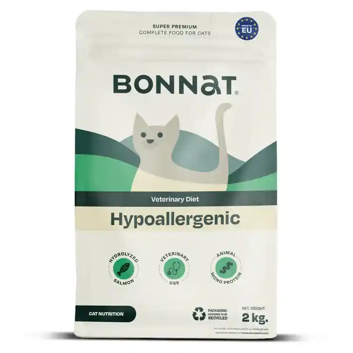 Bonnat Dieta Veterinaria Gato Hipoalergénica x 2kg Presentamos un alimento completo diseñado para gatos adultos, con la finalidad de reducir la intolerancia a ingredientes y nutrientes. Esta fórmula ha sido concebida para brindar respaldo en el manejo de síntomas y afecciones relacionados con alergias y sensibilidades cutáneas. Además, trabaja en la protección de este órgano crucial al prevenir irritaciones, alteraciones y la pérdida de pelaje. La recomendación sobre el uso y la duración de este alimento será tomada por el médico veterinario tratante, quien adaptará estas pautas según las necesidades individuales de cada gato. Beneficios: El salmón hidrolizado es una fuente altamente digestible de proteínas. Producido naturalmente cuando el salmón fresco pasa por hidrólisis enzimática, concentración y secado a baja temperatura. Para uso bajo recomendación veterinaria, apoya el pelaje de protección natural de la piel, mejorando la salud de la piel. El salmón es la única fuente de proteína animal, ayudando a los gatos con intolerancia a otras proteínas animales Ingredientes: Arroz, proteínas de salmón hidrolizadas (20,7%), guisantes, proteína de guisante, aceite de salmón, pulpa de remolacha deshidratada, levaduras, pulpa de achicoria deshidratada, levadura de cerveza, sustancias minerales, fibra vegetal. Fuentes de proteínas: proteínas de salmón hidrolizadas, guisantes, proteína de guisante. Vitamina A: 20000 UI, Vitamina D3: 1000 UI, Vitamina E: 500 mg, Taurina: 1000 mg. OLIGOELEMENTOS: Hierro (sulfato de hierro (II), monohidratado): 33,3 mg, Zinc (óxido de zinc): 140,0 mg, Manganeso (sulfato manganoso, monohidratado): 6,7 mg, Cobre (sulfato de cobre (II) pentahidratado): 6,7 mg, Yodo (yodato de calcio anhidro): 1,0 mg, Selenio (selenito de sodio): 0,1 mg.