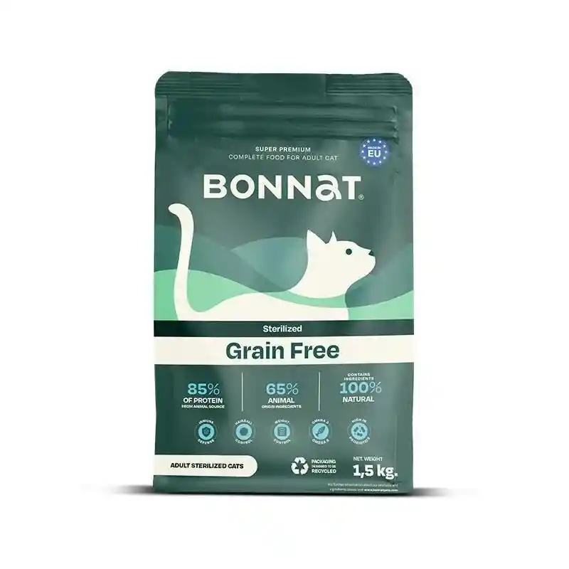 Bonnat presenta su alimento Super Premium Grain-Free, con un 85% de proteína de origen animal y un 65% de ingredientes provenientes de animales, todos naturales. Específicamente formulado para gatos adultos a partir de los 12 meses de vida, este alimento ayuda a los gatos de interior o esterilizados a prevenir la acumulación de bolas de pelo y el sobrepeso, al tiempo que promueve la saciedad. Además, protege la piel y el pelaje, manteniéndolos en óptimas condiciones. Su fórmula también incluye un alto nivel de probióticos que estimulan y mantienen la salud intestinal.