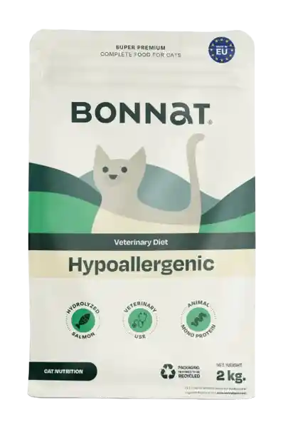 Alimento veterinario especializado hipoalergénico formulado para gatos con sensibilidades alimentarias o intolerancias. Su fórmula utiliza ingredientes seleccionados y proteínas alternativas para minimizar las reacciones alérgicas, mejorar la tolerancia digestiva y apoyar una piel y pelaje saludables.